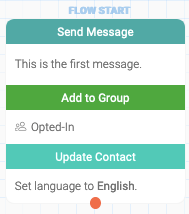 ActionSets are executed in order from top to bottom. In the example below, the contact would (1) receive a message, (2) be added to the “Opted-In” group, and then (3) have their language set to English.