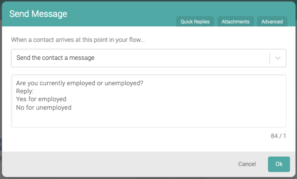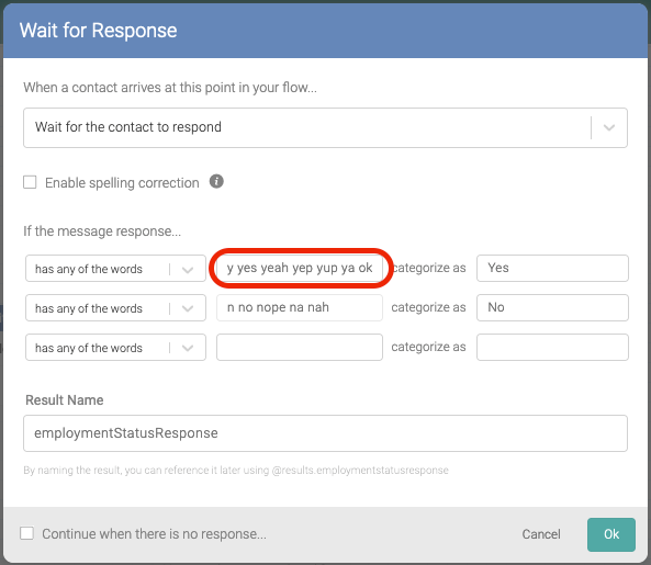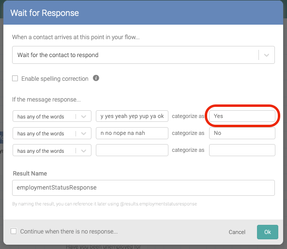 Additionally, a contact’s response will be evaluated from left to right. This means that if a contact responds “I have no job, so yeah” to the question “Are you currently unemployed?” they will be sorted into the No category because “no” appears first in their response. For this reason, we encourage you to explicitly specify the desired responses when you ask a question. See the example below.