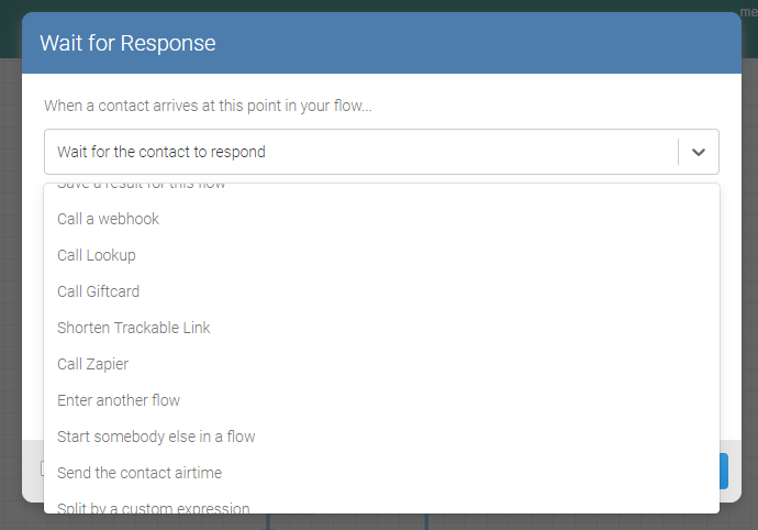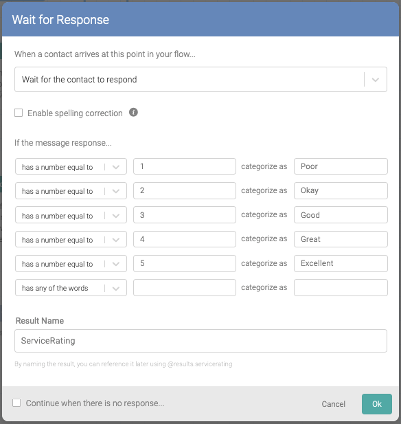 Use the “Wait for Response” action to pause the flow at this action until the contact responds. A contact’s response will be evaluated against the response rules (explained in more detail below).