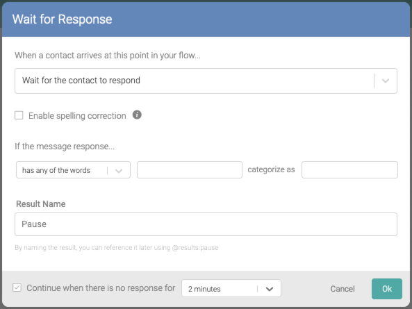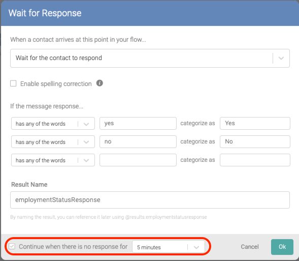 You can also choose to add a timer to a Wait for Response action. The contact will continue in the flow once the set amount of time passes, even if they haven’t responded. To do this, check “Continue when there is no response” and select the desired amount of time.