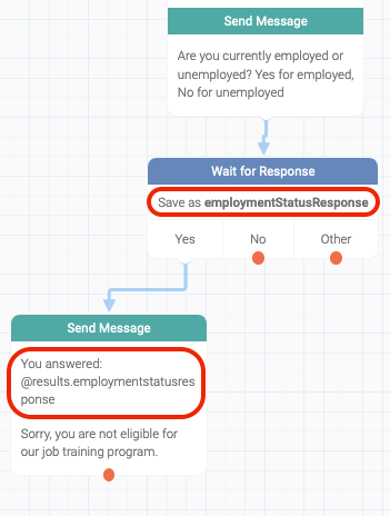Every time you use a “Wait for Response” action, the contact’s response will be saved as a variable, which you can use later. You can reference this result by using @results.resultname.