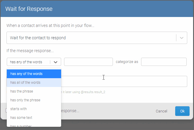 The response rules you select are used to evaluate the contact’s response. The default response rule is “has any of the words.” Click the down arrow to view the other options.