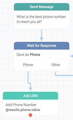 Consider a flow that is running through a webchat. If you wanted to follow-up with that contact in a day or two by text message, you might need to get their phone number. In the example below, we ask for the contact’s phone number and add it as a URN to the contact’s information using the variable @results.phone.value