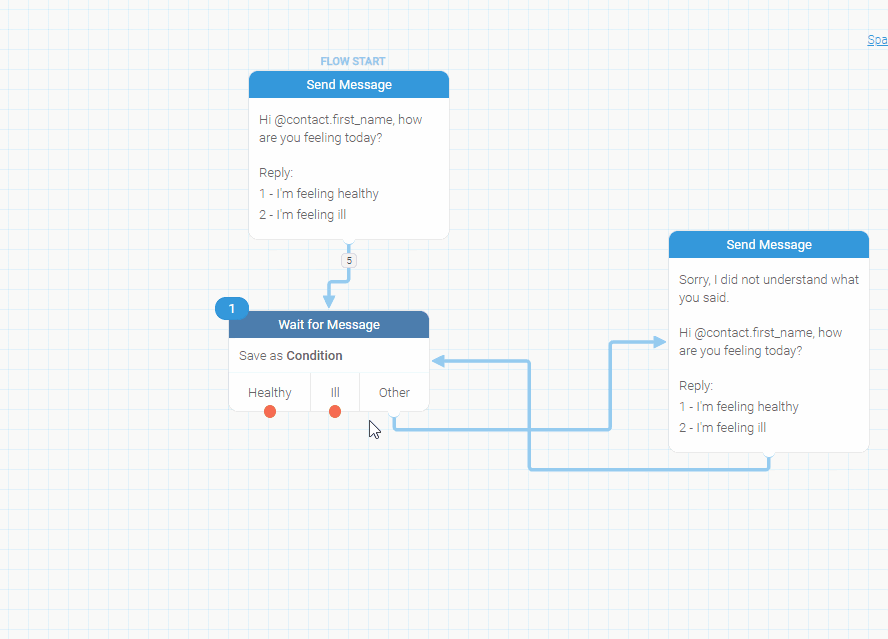 Let's say you're running a therapy adherence study in which participants are asked to indicate how they're feeling each day - healthy or ill. Adding an ”Add Label” action after the "Wait for Message" action pictured below allows you to filter responses that pass through a particular category.