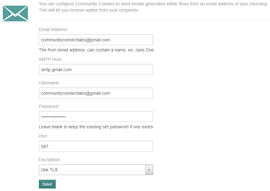 Here we’re using a Gmail-hosted email address. You’ll want to plugin your email address, host URL, credentials, port and encryption preference. In the example above, encryption needs to be set to TLS because that’s the protocol Gmail’s SMTP port 587 uses